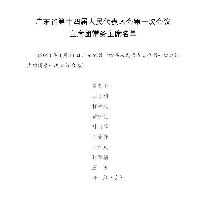 (2023年1月11日廣東省第十四屆人民代表大會第一次會議主席團第一次會議推選)