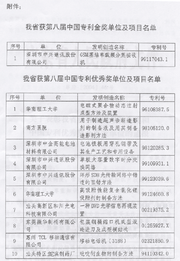 中國(guó)專利優(yōu)秀獎(jiǎng)企事業(yè)單位的通報(bào)