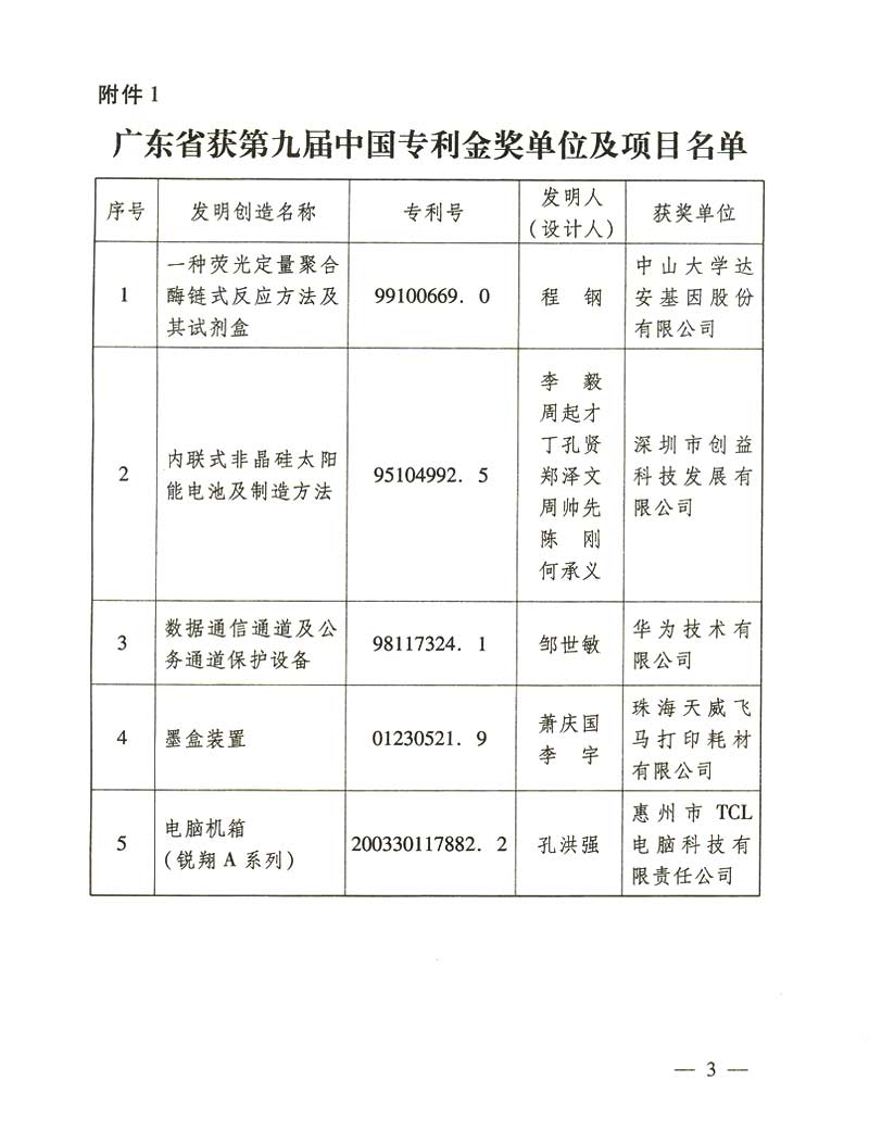 附件:1.廣東省獲得第九屆中國專利金獎單位及項目名單