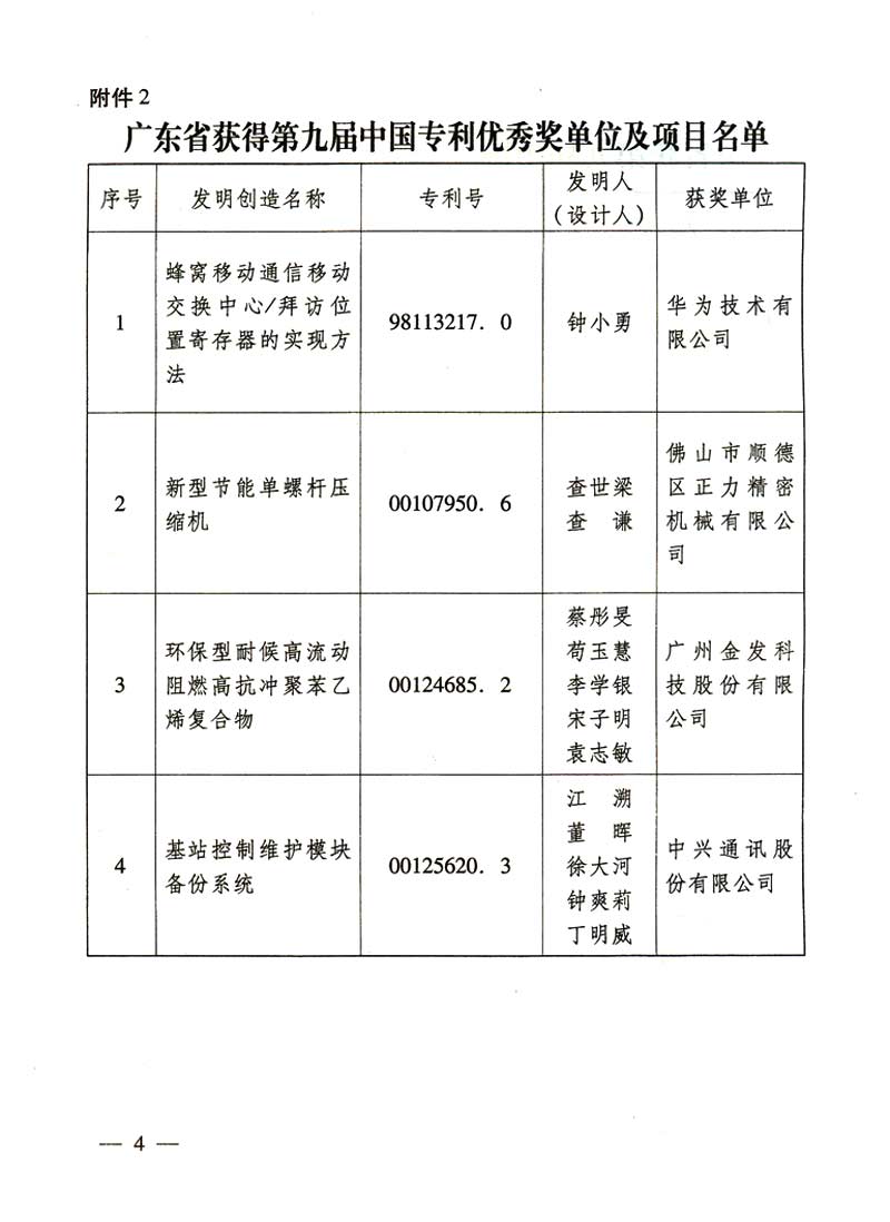 2.廣東省獲得第九屆中國專利優秀獎單位及項目名單