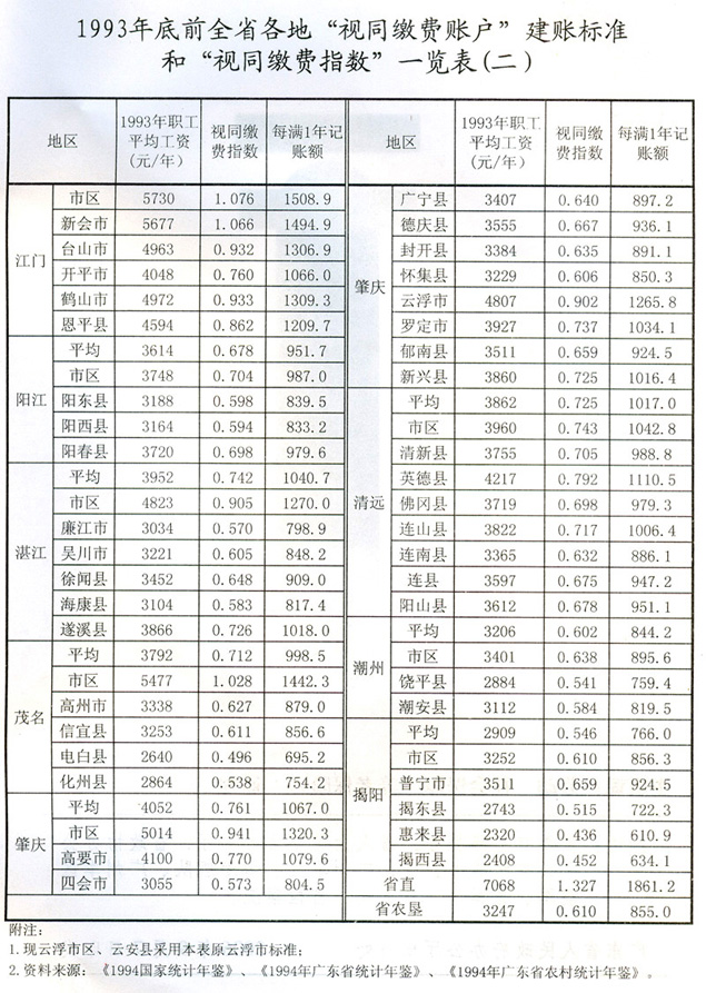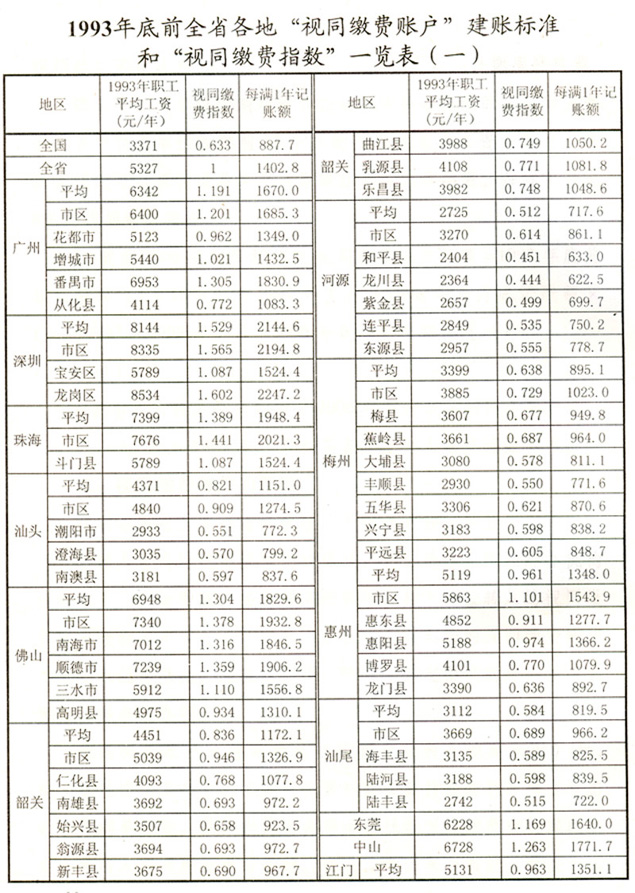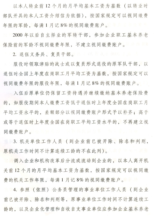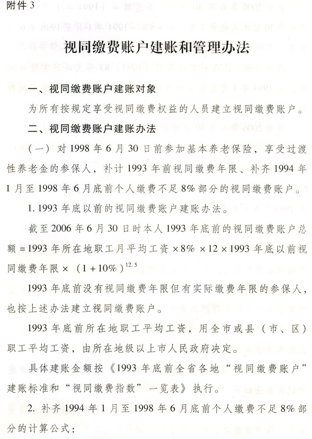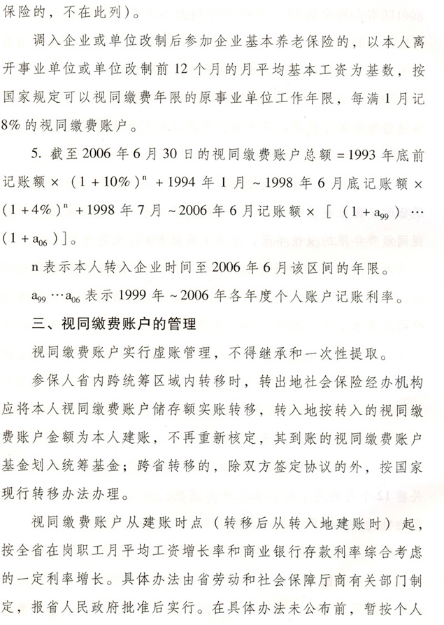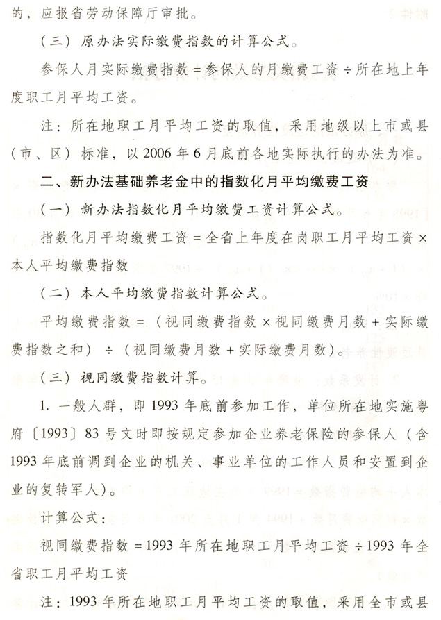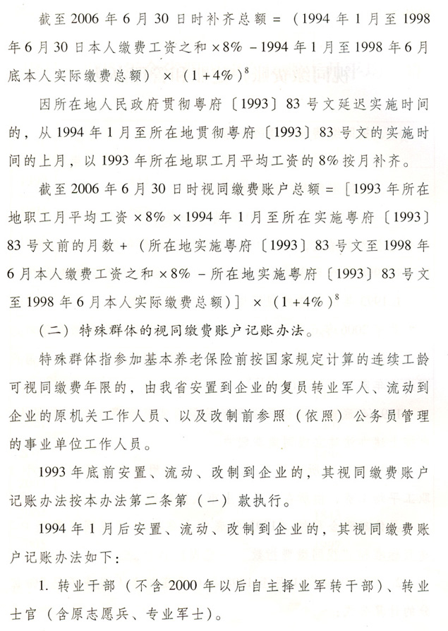 關于貫徹國務院完善企業職工基本 養老保險制度決定的通知 各地級以上市人民政府,各縣(市、區)人民政府,省政府各部門、各直屬機構: 為全面深入貫徹落實《國務院關于完善企業職工基本養老保險制度的決定》(國發〔2005〕38號),進一步推進廣東省社會保障體系建設,決定自2006年7月1日起調整完善廣東省企業職工基本養老保險制度,現就有關工作通知如下: 一、調整個人賬戶記賬規模 從2006年7月1日起,統一將全省企業職工基本養老保險個人賬戶規模從本人繳費工資的11%調整為8%。2006年6月30日前的個人賬戶與2006年7月1日后的個人賬戶合并計算。 各地要做好清理審核調整前后的個人賬戶數據和個人賬戶記錄工作,實現個人賬戶的規范化管理。 二、調整養老保險繳費基數 個人繳費以參保人月應稅工資、薪金收入為基數。參保人月應稅工資、薪金高于全省上年度在崗職工月平均工資300%的,以全省上年度在崗職工月平均工資的300%為繳費基數;參保人月應稅工資、薪金收入低于全省上年度在崗職工月平均工資60%的,以全省上年度在崗職工月平均工資的60%為繳費基數。 參保人所在市(地級以上市,下同)上年度在崗職工月平均工資低于全省上年度在崗職工月平均工資,且本人月應稅工資、薪金低于全省上年度在崗職工月平均工資60%的,可按不低于所在市上年度在崗職工月平均工資的60%為繳費基數,以后逐步過渡到以全省上年度在崗職工月平均工資的60%為繳費基數。 城鎮個體工商戶和靈活就業人員,原則上以全省上年度在崗職工月平均工資為繳費基數。所在市上年度在崗職工月平均工資低于全省上年度在崗職工月平均工資的,也可從所在市上年度在崗職工月平均工資的60%起步,逐步過渡到全省上年度在崗職工月平均工資。 經申報并已核定的2006年6月底前的繳費基數不再重新核定。 三、改革基本養老金計發辦法 從2006年7月1日起,改革企業基本養老金計發辦法。2006年6月30日前已申領基本養老金的參保人,仍按原辦法計發基本養老金,同時執行本通知規定的年度調整辦法。 (一)享受基本養老金的條件。 參保人符合下列條件之一的,可申請按月領取基本養老金: 1.1998年7月1日后參加基本養老保險,達到國家規定退休年齡,累計繳費年限(含視同繳費年限,下同)滿15年的; 2.1998年6月30日前參加基本養老保險,2013年6月30日前達到國家規定的退休年齡,累計繳費年限滿10年的; 3.1998年6月30日前參加基本養老保險,2013年7月1日后達到國家規定的退休年齡,累計繳費年限滿15年的; 41998年6月30日前應參保未參保,1998年7月1日以后辦理參保補繳手續,達到國家規定的退休年齡,累計繳費年限滿15年的。 (二)基本養老金計發辦法。 1.1998年7月1日后參加基本養老保險的參保人,基本養老金由基礎養老金和個人賬戶養老金組成。 (1)基礎養老金月標準為: 基礎養老金=(全省上年度在崗職工月平均工資+本人指數化月平均繳費工資)÷2×繳費年限(含視同繳費年限)×1% 本人指數化月平均繳費工資的計算辦法見附件2。 參保人指數化月平均繳費工資低于全省上年度在崗職工月平均工資的60%的,基礎養老金月標準為: 基礎養老金=(全省上年度在崗職工月平均工資×a+本人指數化月平均繳費工資)÷2×繳費年限(含視同繳費年限)×1% a=本人平均繳費指數÷0.6,今后可隨廣東省區域經濟發展情況進行適當調整。 基礎養老金從基本養老保險統籌基金中支付。 (2)個人賬戶養老金月標準為: 以本人首次領取基本養老金時個人賬戶儲存額除以計發月數,計發月數按國發〔2005〕38號文的規定執行(見附件1)。個人賬戶養老金從本人個人賬戶基金中支付。 2.具有視同繳費權益并建立了視同繳費賬戶的下列參保人,在計發基礎養老金和個人賬戶養老金的基礎上,再計發過渡性養老金: (1)1998年6月30日前參加基本養老保險,2006年7月1日以后符合按月領取基本養老金條件的; (2)1998年7月1日后參加基本養老保險,參保前具有按國家規定的視同繳費年限,2006年7月1日后符合按月領取基本養老金條件的。 3.首次領取的過渡性養老金月標準為: (1)1998年6月30日前參加基本養老保險的,以首次領取基本養老金時本人視同繳費賬戶總額除以120; (2)1998年7月1日后參加基本養老保險,2006年6月30日前已具有按國家規定的視同繳費年限的,以本人視同繳費賬戶總額除以120;2006年7月1日后開始具有按國家規定的視同繳費年限的,以本人視同繳費賬戶總額除以個人賬戶計發月數。 過渡性養老金從基本養老保險統籌基金中支付。 各級社會保險經辦機構要在2008年年底前完成參保人視同繳費賬戶的核定與建賬工作。視同繳費賬戶的建賬與管理辦法見附件3。 (三)過渡期計發辦法。 為保證基本養老金新計發辦法與原計發辦法的平穩過渡,設置5年過渡期(2006年7月1日至2011年6月30日),過渡期內實行將新辦法與原辦法對比并按差額計發基本養老金的做法。 1.對過渡期內申領基本養老金的參保人,按新辦法計算的基本養老金低于按原辦法計算的基本養老金的,其差額部分作為補差計發。 按新辦法計算的基本養老金高于按原辦法計算的基本養老金的,高出部分按下列比例計發:2006年7月1日至2007年6月30日期間首次領取待遇的計發10%;2007年7月1日至2008年6月30日期間首次領取待遇的計發30%;2008年7月1日至2009年6月30日期間首次領取待遇的計發50%;2009年7月1日至2010年6月30日期間首次