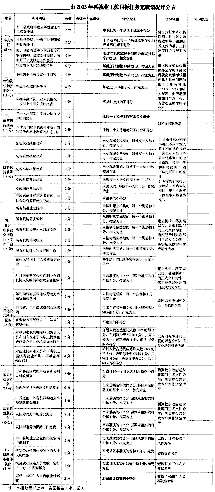 廣東省2003年再就業(yè)工作目標責任制考評辦法為進一步貫徹落實《中共廣東省委、廣東省人民政府關(guān)于貫徹〈中共中央、國務院關(guān)于進一 步做好再就業(yè)工作的通知〉的意見》(粵發(fā)〔2002〕15號)和廣東省人民政府《關(guān)于建立再 就業(yè)工作目標責任制的通知》(粵府辦〔2003〕80號),大力推動就業(yè)和再就業(yè)工作,特制 定本辦法。 一、考評內(nèi)容 (一)落實再就業(yè)工作目標責任制情況; (二)增加就業(yè)崗位和控制失業(yè)情況; (三)落實就業(yè)和再就業(yè)政策情況; (四)健全街道社區(qū)勞動保障工作平臺情況; (五)強化公共就業(yè)服務和再就業(yè)培訓情況; (六)加大再就業(yè)資金投入情況; (七)幫助困難群體就業(yè)情況。 省再就業(yè)工作領(lǐng)導小組可根據(jù)黨中央、國務院和省委、省政府對新一年的工作部署,于每年 第一季度調(diào)整確定當年的考評內(nèi)容,并予公布。 二、指標和分值 (一)落實責任制(8分) 1.各地級以上市政府,各縣(市、區(qū))政府均建立再就業(yè)工作目標責任制,并將年度再就 業(yè)工作目標任務逐級下達到街道(鄉(xiāng)鎮(zhèn))和有關(guān)部門(4分)。 2.健全各地級以上市政府,各縣(市、區(qū))政府再就業(yè)工作領(lǐng)導機構(gòu)、工作制度,每年召 開2次以上工作協(xié)調(diào)會議(4分)。 (二)增加崗位和控制失業(yè)(18分) 完成省再就業(yè)工作領(lǐng)導小組下達的年度凈增就業(yè)崗位數(shù)(6分)、下崗失業(yè)人員再就業(yè)計劃 數(shù)(4分)、城鎮(zhèn)登記失業(yè)率控制數(shù)(4分)、準確掌握下崗失業(yè)人員情況,并按時上報有關(guān) 統(tǒng)計報表(4分)。 (三)落實再就業(yè)政策(18分) 1.各地級以上市政府、市有關(guān)部門及時出臺貫徹國家和省委、省政府、省有關(guān)部門各項就 業(yè)和再就業(yè)政策的實施辦法,且要具有結(jié)合實際、切實可行、操作性強等特點(5分)。 2.各有關(guān)部門能及時兌現(xiàn)下崗失業(yè)人員、用人單位和有關(guān)服務機構(gòu)按規(guī)定應該享受申請的 各項再就業(yè)扶持政策和補貼資金(10分)。 3.開展再就業(yè)優(yōu)惠政策宣傳、向社會公布監(jiān)督舉報電話(3分)。 (四)健全街道社區(qū)勞動保障工作平臺(15分) 2003年8月底前在所有城市街道和工作任務重的鄉(xiāng)鎮(zhèn)建立勞動保障工作機構(gòu)(3分),做到機 構(gòu)、人員、經(jīng)費、場地、制度和工作“六到位”(8分),在街道社區(qū)聘請工作人員并落實 工作經(jīng)費(4分)。 (五)強化公共就業(yè)服務和再就業(yè)培訓(18分) 1.2003年8月底前,縣以上政府落實公益性職業(yè)介紹機構(gòu)的人員編制和財政撥款經(jīng)費(3分 );2003年底前,各縣(市、區(qū))均建成勞動力市場場地和信息網(wǎng)絡,各地級以上市 勞動力市場實現(xiàn)與省信息聯(lián)網(wǎng),并與所轄50%的縣(市、區(qū))聯(lián)網(wǎng)(5分)。 2.在勞動力市場開設下崗失業(yè)登記、職業(yè)介紹、職業(yè)指導、職業(yè)培訓、勞動保障事務代理 、受理享受再就業(yè)扶持政策資格認定申請等“一站式”服務(3分)。 3.對登記求職的城鎮(zhèn)登記失業(yè)人員和國有企業(yè)下崗職工提供免費職業(yè)介紹,介紹成功率40% 以上(3分)。 4.對有培訓愿望的城鎮(zhèn)登記就業(yè)轉(zhuǎn)失業(yè)人員和國有企業(yè)下崗職工提供免費再就業(yè)培訓,培 訓后再就業(yè)率60%以上(4分)。 (六)加大再就業(yè)資金投入(15分) 各地級以上市,各縣(市、區(qū))均把再就業(yè)資金納入財政預算(3分),按本市下崗失業(yè)人 員再就業(yè)人數(shù)所需資金安排落實各項補貼資金(6分),建立小額擔保貸款基金(2分),勞 動力市場和信息網(wǎng)絡建設資金(2分),街道(鄉(xiāng)鎮(zhèn))社區(qū)勞動保障工作經(jīng)費(2分)。 (七)幫助困難群體就業(yè)(8分) 1.建立公益性崗位空崗申報制度,落實公益性崗位安置下崗失業(yè)人員措施(4分)。 2.建立健全再就業(yè)援助制度,摸清就業(yè)困難人員底數(shù),完成省下達的“4050”人員再就業(yè) 數(shù)(4分)。 各項考評內(nèi)容的評分計算標準和統(tǒng)計方法,見《2003年再就業(yè)工作目標落實情況評分表》( 附后)。 三、考評步驟 (一)自評:2004年1月31日前,各地級以上市政府組織對本市2003年再就業(yè)工作目 標責任制執(zhí)行情況進行自評,填寫《評分表》,連同2003年再就業(yè)工作總結(jié)和自評情況的書 面報告報省再就業(yè)工作領(lǐng)導小組辦公室(設在省勞動保障廳)。 (二)核對:省再就業(yè)工作領(lǐng)導小組辦公室對各地級以上市自評情況進行核對。核對 有疑點的,有關(guān)市應對該項考評內(nèi)容進行核實,并補充相關(guān)證據(jù)。 (三)抽查:省再就業(yè)工作領(lǐng)導小組組成檢查組,赴各地級以上市,各縣(市、區(qū)、 街道)進行實地抽查核實,抽查面應不少于所有地級以上市的40-50%。 (四)評定:省再就業(yè)工作領(lǐng)導小組辦公室根據(jù)自查、核對和抽查的結(jié)果提出初評意 見,提請省再就業(yè)工作領(lǐng)導小組全體成員單位會議評定。 四、獎懲辦法 (一)考評分數(shù)在90分及以上的為達標市,省政府給予通報表彰,頒發(fā)證書并獎勵8萬元。 連續(xù)三年達標或明、后兩年評分均在95分以上的,可參加再就業(yè)工作先進市評選。 (二)考評分