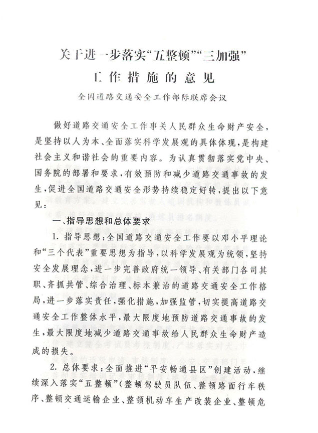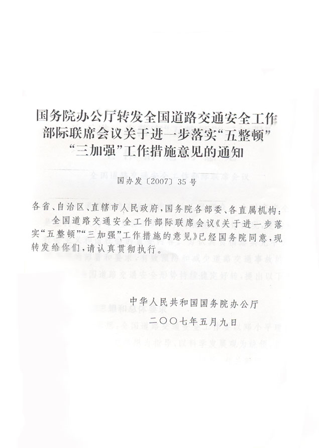 現將《國務院辦公廳轉發全國道路交通安全工作部際聯席會議關于進一步落實“五整頓”“三加強”工作措施意見的通知》(國辦發〔2007〕35號)轉發給你們,經省人民政府同意,結合我省實際,提出如下意見,請一并貫徹執行。