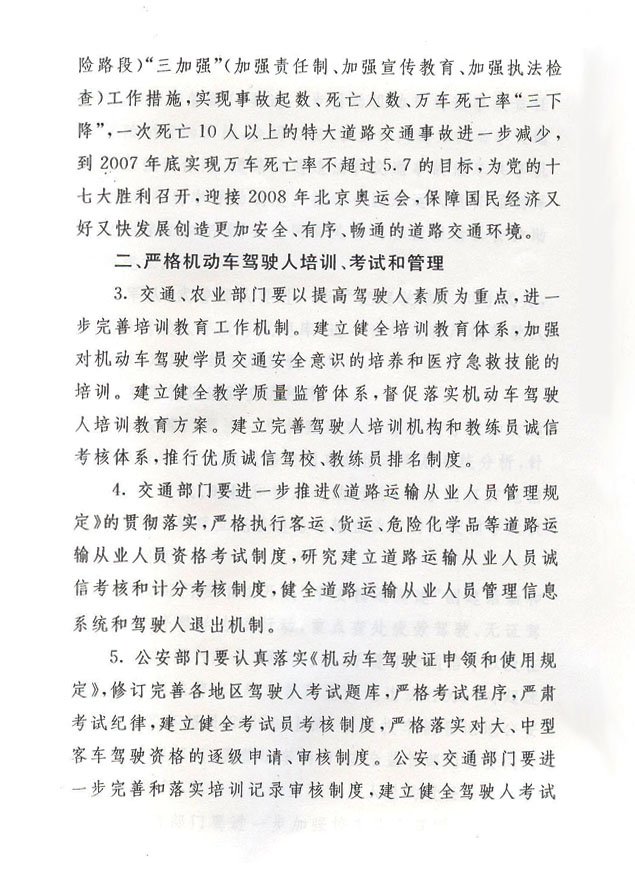 一、提高思想認識。各地、各有關部門要從實踐“三個代表”重要思想,全面落實科學發展觀,構建社會主義和諧社會的高度,充分認識加強道路交通安全管理,預防道路交通事故的重大意義,以“五整頓”(整頓駕駛員隊伍、整頓路面行車秩序、整頓交通運輸企業、整頓機動車生產改裝企業、整頓危險路段)“三加強”(加強責任制、加強宣傳教育、加強執法檢查)為主線,切實加強道路交通安全管理,及時消除各類安全隱患,有效預防和減少重特大道路交通事故發生,實現事故起數、死亡人數、萬車死亡率“三下降”,一次死亡10人以上的特大道路交通事故進一步減少,到2007年底全省萬車死亡率不超過5.6的目標,為促進我省經濟社會又好又快發展,迎接黨的十七大勝利召開創造良好的交通環境。
