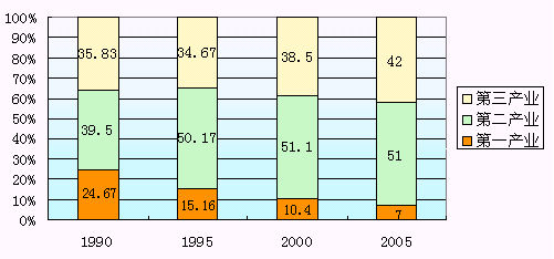 ?。矗谌a業對外開放領域不斷擴大。外商投資第三產業的領域已從改革開 放初的飲食服務業和旅館業擴展到商貿、文化、體育、娛樂、旅游、衛生、教育、 電信、科研、房地產等行業。1990-1999年,我省第三產業實際利用外 資累計267.5億美元,年均增長26.2%。第三產業實際利用外資占全省 實際利用外資的比重由1990年的20.6%擴大到1993年的29.9%, 后緩慢降到1999年23.3%。  ?。担谌a業已成為我省新增就業的主體。傳統第三產業的快速增長為勞動 力就業提供了較大空間,國民經濟和社會信息化的推進以及專業化、技術化的新 興行業的發展創造了大量的就業崗位。1999年,我省第三產業從業人員10 40.49萬人,比1995年新增161.89萬人,占同期全社會新增從業 人數的66%。  ?。叮榻侵蕹蔀槿〉谌a業發展中心。珠江三角洲經濟區基礎條件良 好,經過近年的迅速發展,其第三產業所占比重高于全省平均水平,而且在全省 第三產業增加值中占七成以上。1999年珠江三角洲經濟區第三產業占國內生 產總值的比重達到43.9%。廣州、深圳已成為全國性的商貿中心,珠江三角 洲已成為具有相當國際影響的外貿基地。   (二)問題與不足  ?。保偭坎蛔?,結構欠優。目前,我省第三產業比重不僅低于世界發達國家 (超過60%),甚至低于一些發展中國家(1998年印度第三產業比重達4 5%),與現代化要求有較大差距。同時,產業整體素質不高,行業發展不平衡。 信息咨詢業、科技服務業、教育、文化、衛生業等發展步伐有待進一步加快。房 地產業等仍需進一步規范管理和加快發展。  ?。玻袌龌潭炔桓?,產業化步伐有待加快。不少服務業市場準入的限制較 多,競爭不充分。市場法制建設薄弱,市場規則和市場組織不健全。電信、鐵道、 港口、市政、外貿、教育等行業壟斷經營、管制經營、限制經營的領域還比較多, 多數服務產品的價格仍以政府制定和管理為主,尚未建立市場決定服務產品價格 的機制。衛生、文化、體育、教育、科技服務等領域缺乏自我發展機制。許多行 業尚處于產業化進程的起步階段,企事業單位、高等院校等后勤社會化改革步伐 還需加快。   3.國際化水平不高,國際競爭力較弱。第三產業整體開放程度還較低。除 房地產、旅館、娛樂等行業外,多數服務行業仍然限制或禁止外商投資,服務產 品的質量、效益和結構難以適應國際競爭的要求。國際服務貿易發展落后。