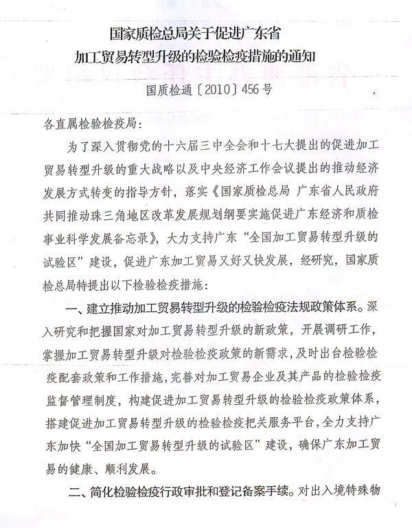 各地級(jí)以上市人民政府,省政府各部門(mén)、各直屬機(jī)構(gòu): 近日,國(guó)家質(zhì)檢總局根據(jù)廣東出入境檢驗(yàn)檢疫局調(diào)研意見(jiàn),出臺(tái)了《國(guó)家質(zhì)檢總局關(guān)于促進(jìn)廣東省加工貿(mào)易轉(zhuǎn)型升級(jí)的檢驗(yàn)檢疫措施的通知》(國(guó)質(zhì)檢通〔2010〕456號(hào)),支持我省建設(shè)全國(guó)加工貿(mào)易轉(zhuǎn)型升級(jí)試驗(yàn)區(qū)。根據(jù)省政府領(lǐng)導(dǎo)意見(jiàn),現(xiàn)將國(guó)質(zhì)檢通〔2010〕456號(hào)文轉(zhuǎn)發(fā)給你們,請(qǐng)認(rèn)真組織學(xué)習(xí)宣傳,配合做好相關(guān)工作。同時(shí),各地、各部門(mén)要借鑒國(guó)家質(zhì)檢總局和廣東出入境檢驗(yàn)檢疫局的做法,積極采取有效措施,為加工貿(mào)易企業(yè)轉(zhuǎn)型升級(jí)提供優(yōu)質(zhì)、高效的服務(wù)。