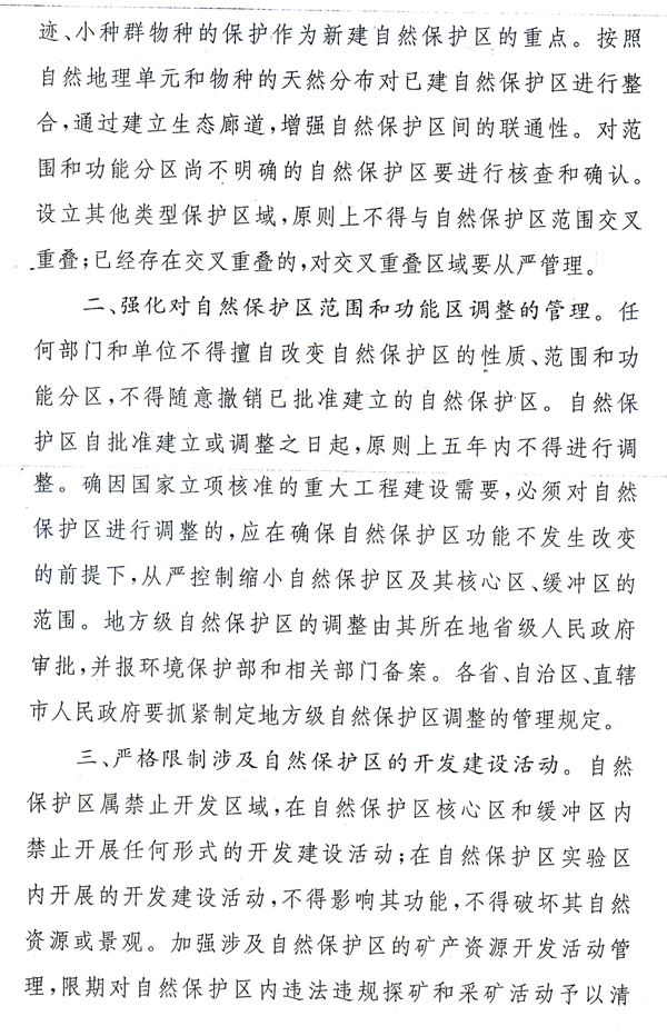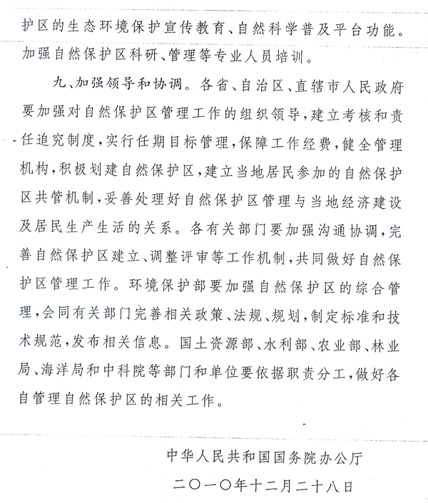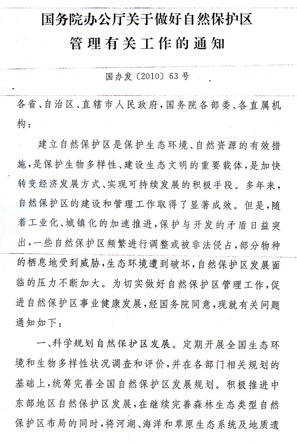 轉(zhuǎn)發(fā)國務(wù)院辦公廳關(guān)于做好自然保護區(qū) 管理有關(guān)工作的通知 ? 各地級以上市人民政府,各縣(市、區(qū))人民政府,省政府各部門、各直屬機構(gòu): 現(xiàn)將《國務(wù)院辦公廳關(guān)于做好自然保護區(qū)管理有關(guān)工作的通知》(國辦發(fā)〔2010〕63號)轉(zhuǎn)發(fā)給你們,請認真貫徹執(zhí)行。 近年來,在各地、各有關(guān)部門的共同努力下,我省自然保護區(qū)建設(shè)工作取得顯著成績,全省共建成自然保護區(qū)360個,其中,國家級11個、省級66個,自然保護區(qū)數(shù)量居全國首位,為建設(shè)“綠色廣東”和環(huán)境友好型社會發(fā)揮了重要作用。但一些地區(qū)自然保護區(qū)也存在重申報輕保護、重建設(shè)輕管理和地方級自然保護區(qū)調(diào)整程序不規(guī)范等問題。省人民政府要求,各地、各有關(guān)部門要按照國辦發(fā)〔2010〕63號文的部署和要求,進一步加強自然保護區(qū)建設(shè)管理工作,提升自然保護區(qū)管理和保護水平,為加快轉(zhuǎn)型升級、建設(shè)幸福廣東提供生態(tài)環(huán)境保障。 我省地方級自然保護區(qū)調(diào)整管理規(guī)定另行印發(fā)。 ? ? ? 廣東省人民政府辦公廳 二○一一年二月十四日 ? ? ?