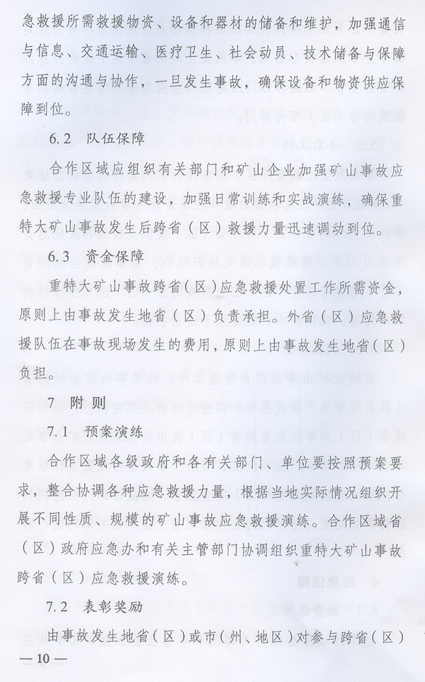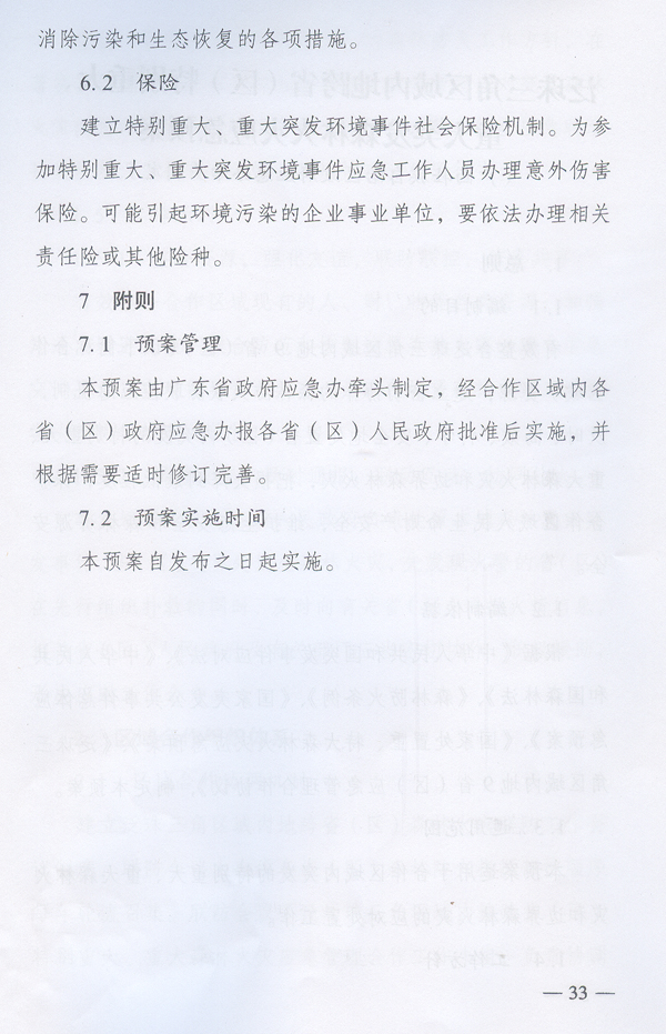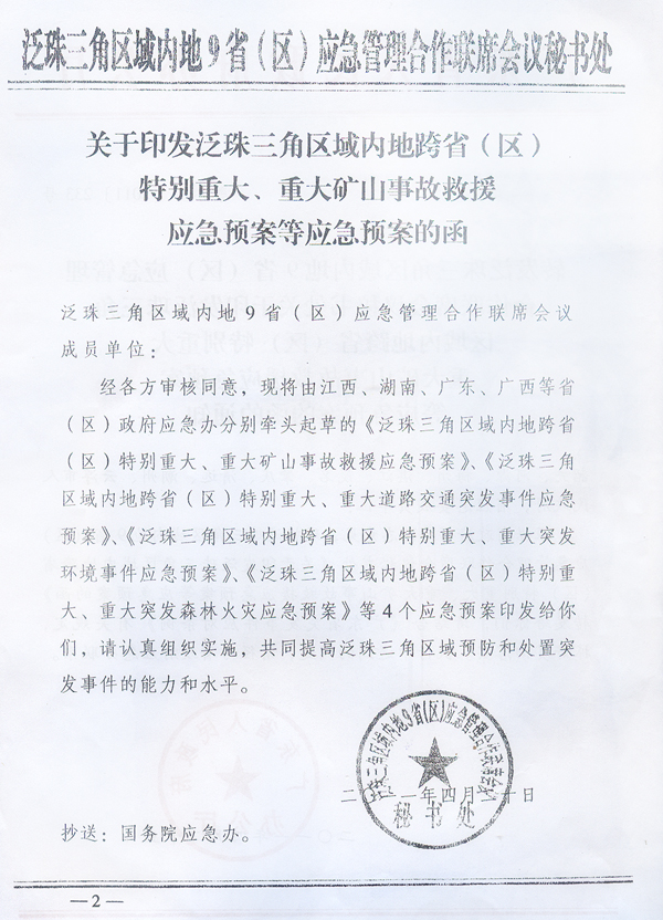 ? 轉發(fā)泛珠三角區(qū)域內地9?。▍^(qū))應急管理 合作聯(lián)席會議秘書處關于印發(fā)泛珠三角 區(qū)域內地跨?。▍^(qū))特別重大、 重大礦山事故救援應急預案 等應急預案的函的通知 ? 韶關、河源、梅州、湛江、茂名、肇慶、清遠、潮州、云浮市人民政府,省應急委成員單位: 根據(jù)省政府領導同志意見,現(xiàn)將泛珠三角區(qū)域內地9?。▍^(qū))應急管理合作聯(lián)席會議秘書處《關于印發(fā)泛珠三角區(qū)域內地跨省(區(qū))特別重大、重大礦山事故救援應急預案等應急預案的函》轉發(fā)給你們,請結合《廣東省突發(fā)事件應對條例》有關規(guī)定,抓好貫徹落實。執(zhí)行中遇到的問題,請徑與省政府應急辦聯(lián)系。 ? ? ? 廣東省人民政府辦公廳 二○一一年四月二十五日 ? ? ?
