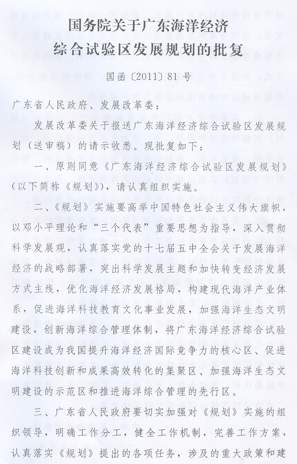 現將《國務院關于廣東海洋經濟綜合試驗區發展規劃的批復》(國函〔2011〕81號)轉發給你們,請遵照執行。