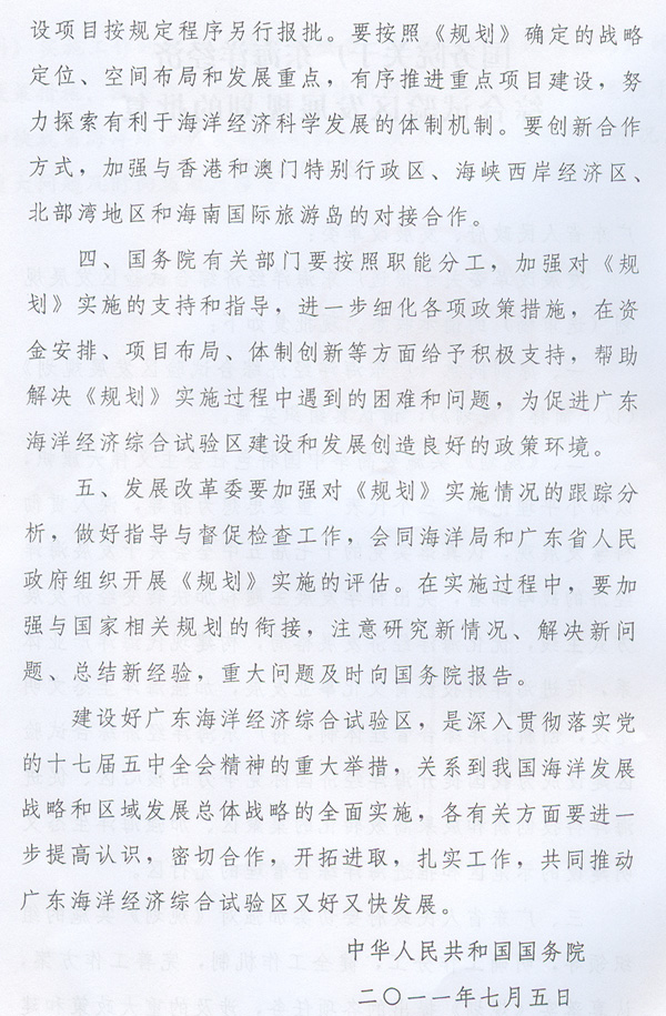 《廣東海洋經濟綜合試驗區發展規劃》(以下簡稱《規劃》)是繼《珠江三角洲地區改革發展規劃綱要(2008-2020年)》之后,推動我省經濟社會發展的又一國家層面的規劃,為我省探索海洋開發新途徑和海洋綜合管理新模式,加快海洋經濟發展,建設海洋經濟強省,爭當全國海洋事業發展排頭兵創造了新的重大機遇。各地、各有關部門要高度重視,把實施《規劃》作為“加快轉型升級、建設幸福廣東”的重要舉措,結合本地區、本部門實際,科學謀劃,精心部署,采取有效措施,推動我省海洋經濟加快發展。省發展改革委要會同省海洋漁業局加強對《規劃》實施工作的指導、監督和檢查,抓緊制定實施《規劃》的政策措施,注重研究新情況、解決新問題,加快建立完善有利于加快我省海洋綜合開發的體制機制;要及時跟蹤分析實施情況,重大問題及時向省政府報告。