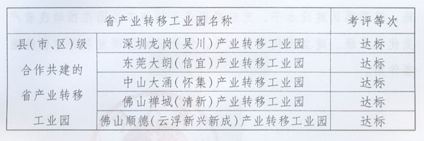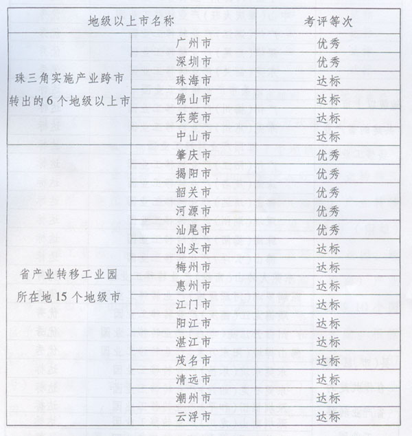 關于2010年度產業轉移目標 責任考評情況的通報 ? 各地級以上市人民政府,省政府各部門、各直屬機構: 為貫徹落實《中共廣東省委廣東省人民政府關于推進產業轉移和勞動力轉移的決定》(粵發〔2008〕4號),加快推進我省產業轉移工作,按照省政府《印發廣東省產業轉移目標責任考核評價辦法的通知》(粵府函〔2010〕132號,以下簡稱《考評辦法》)要求,省經濟和信息化委會同省雙轉移工作領導小組成員單位,共同組織開展了2010年度產業轉移目標責任考核評價工作。現將考評情況通報如下: 一、2010年度全省產業轉移工作取得顯著成效 (一)經濟規模不斷發展壯大。截至2010年底,全省34個省產業轉移工業園入園項目(包括意向項目)達2423個,總投資額達5447億元,其中已建成1196個,投資額1181.6億元。全年實現產值1953.6億元、稅收108.85億元,同比分別增長115.4%和105%。 (二)區域經濟帶動作用持續增強。2010年,省產業轉移工業園實現工業增加值479億元,同比增長40.3%,占粵東西北地區工業增加值的13.5%。15個產業轉入地級市中,8個地級市園區工業增加值占全市比重超過10%,6個地級市比重達到或接近20%。 (三)引進項目質量顯著提高。2010年,省產業轉移工業園引進投資額超過10億元的大型項目和項目組團達42個,比2009年增加20個;入園單個項目平均投資額達2.25億元,比2009年提高21.6%。 (四)珠三角地區“騰籠換鳥”成效顯現。珠三角各市充分利用產業轉移騰出的發展空間,形成了各具特色的以產業轉移促進轉型升級的模式,使現代服務業、高技術制造業、先進制造業占地區生產總值的比重不斷上升。2010年,珠三角6個產業轉出市的先進制造業產值占地區生產總值的比重比2009年提高2.2個百分點,高技術制造業產值占地區生產總值的比重比2009年提高0.9個百分點(其中東莞市高出5.1個百分點)。有關市人均生產總值的增速與地區生產總值的增速差距不斷縮小。 二、考評結果 (一)各地級以上市政府考評結果。 全省21個地級以上市2010年度產業轉移目標責任考核全部達標,具體情況如下: