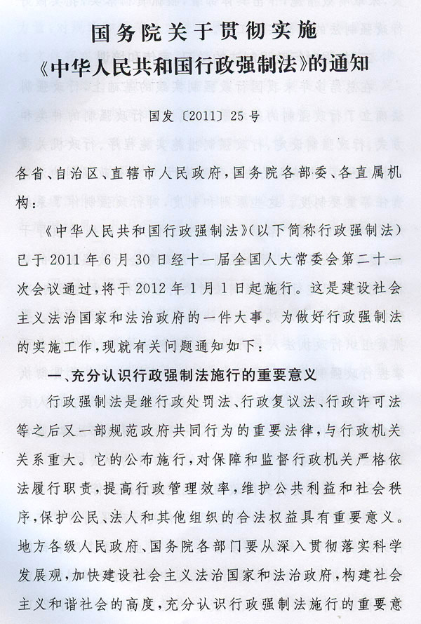 轉發國務院關于貫徹實施 《中華人民共和國行政強制法》的通知 ?