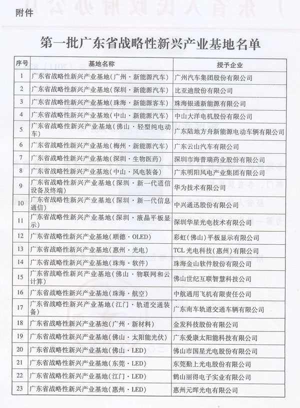 經省人民政府同意,確定廣州新能源汽車等23家產業基地為第一批廣東省戰略性新興產業基地,現予公布。
