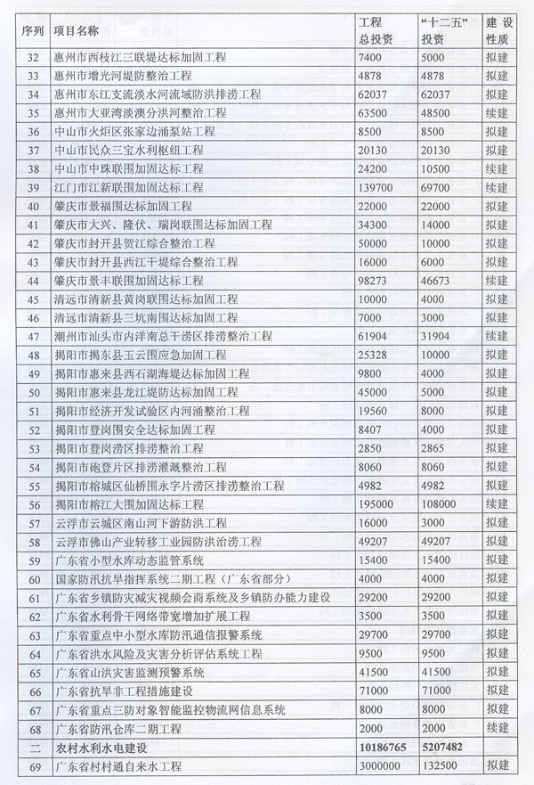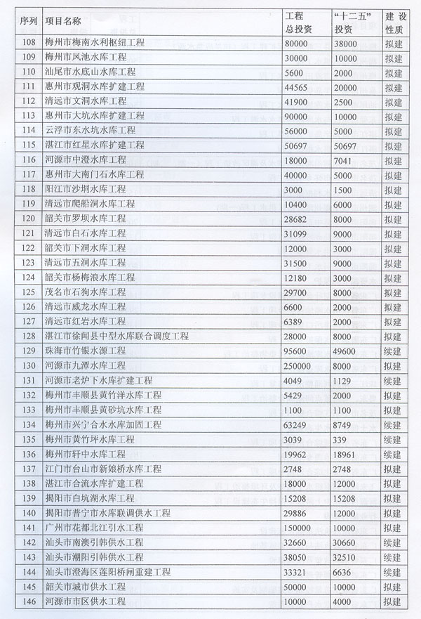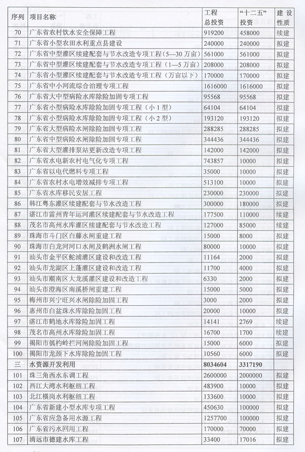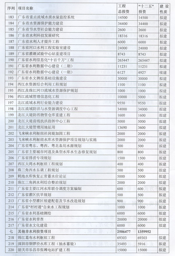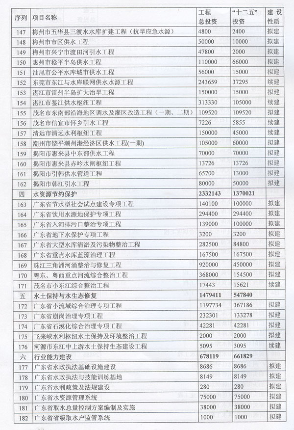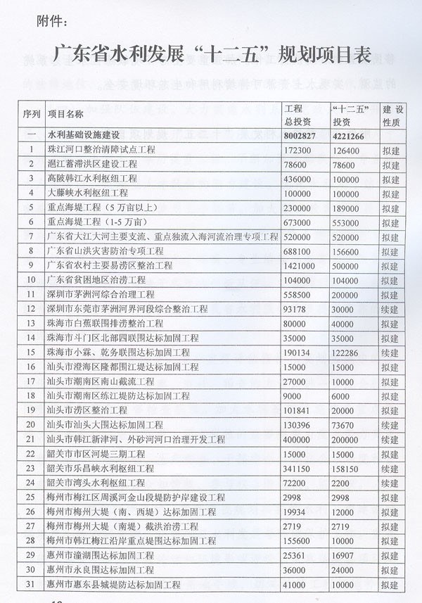 ? 印發(fā)廣東省水利發(fā)展“十二五”規(guī)劃的通知 ? 各地級(jí)以上市人民政府,各縣(市、區(qū))人民政府,省政府各部門(mén)、各直屬機(jī)構(gòu): 《廣東省水利發(fā)展“十二五”規(guī)劃》已經(jīng)省人民政府同意,現(xiàn)印發(fā)給你們,請(qǐng)認(rèn)真貫徹實(shí)施。實(shí)施中遇到的問(wèn)題,請(qǐng)徑向省水利廳、發(fā)展改革委反映。 ? ? ? ? 廣東省人民政府辦公廳二○一一年十二月二十九日 ? ? ? 廣東省水利發(fā)展“十二五”規(guī)劃 ? ? ? ? 目 錄 ? 一、現(xiàn)狀與形勢(shì) …………………………………………………………(1) (一)“十一五”時(shí)期廣東水利發(fā)展成效顯著…………………………(1) (二)“十二五”時(shí)期廣東水利發(fā)展形勢(shì)………………………………(2) 1.廣東水利跨越式發(fā)展面臨的挑戰(zhàn) ……………………………………(2) 2.廣東水利發(fā)展進(jìn)入重要戰(zhàn)略機(jī)遇期 …………………………………(3) 二、指導(dǎo)思想、基本原則和規(guī)劃目標(biāo)……………………………………(3) (一)指導(dǎo)思想……………………………………………………………(3) (二)基本原則……………………………………………………………(4) (三)規(guī)劃目標(biāo)……………………………………………………………(5) 三、主要任務(wù)………………………………………………………………(6) (一)完善農(nóng)村水利基礎(chǔ)設(shè)施……………………………………………(6) 1.突出加強(qiáng)農(nóng)田水利建設(shè) ………………………………………………(6) 2.繼續(xù)推進(jìn)農(nóng)村飲水安全工程 …………………………………………(6) 3.開(kāi)展農(nóng)村重點(diǎn)易澇區(qū)整治 ……………………………………………(7) 4.加強(qiáng)農(nóng)村水電與電氣化建 ……………………………………………(7) 5.推進(jìn)水庫(kù)移民安居工程建設(shè) …………………………………………(7) (二)加強(qiáng)防洪體系建設(shè)…………………………………………………(7) 1.完善主要江河防洪體系 ………………………………………………(7) 2.加強(qiáng)中小河流治理 ……………………………………………………(8) 3.加快推進(jìn)“千里海堤加固達(dá)標(biāo)工程” ………………………………(8) 4.繼續(xù)實(shí)施病險(xiǎn)水庫(kù)水閘除險(xiǎn)加固工程 ………………………………(8) 5.強(qiáng)化山洪災(zāi)害防治 ……………………………………………………(9) 6.強(qiáng)化非工程措施建 ……………………………………………………(9) (三)優(yōu)化水資源配………………………………………………………(9) 1.加快建設(shè)水利樞紐及河庫(kù)水系連通工程 ……………………………(9) 2.加快建設(shè)調(diào)引提蓄水工程 ……………………………………………(10) 3.加快推進(jìn)應(yīng)急備用水源及非常規(guī)水源建設(shè) …………………………(10) (四)加強(qiáng)水資源保護(hù)與節(jié)約……………………………………………(10) 1.加強(qiáng)重點(diǎn)飲用水水源地保護(hù) …………………………………………(10) 2.加強(qiáng)水庫(kù)水資源保護(hù) …………………………………………………(11) 3.加大地下水保護(hù)力度 …………………………………………………(11) 4.加強(qiáng)重點(diǎn)河道(涌)整治 ……………………………………………(11) 5.加強(qiáng)水土保持與生態(tài)修復(fù) ……………………………………………(11) 6.全面推進(jìn)節(jié)水型社會(huì)建設(shè) ……………………………………………(11) (五)實(shí)行最嚴(yán)格水資源管理制度………………………………………(12) 1.建立用水總量控制制度 ………………………………………………(12) 2.建立用水效率控制制度 ………………………………………………(12) 3.建立水功能區(qū)限制納污制度 …………………………………………(13) (六)深化水利體制機(jī)制改革……………………………………………(13) 1.深化水管體制改革 ……………………………………………………(13) 2.加強(qiáng)水利法制建設(shè) ……………………………………………………(13) 3.大力提升水利行業(yè)能力 ………………………………………………(13) 4.提高水利應(yīng)急管理能力 ………………………………………………(14) 5.強(qiáng)化水行政執(zhí)法能力 …………………………………………………(14) 6.推動(dòng)水文化建設(shè) ………………………………………………………(15) 四、保障措施………………………………………………………………(15) (一)加強(qiáng)組織領(lǐng)導(dǎo)………………………………………………………(15) (二)加大資金投入………………………………………………………(15) (三)科學(xué)制訂規(guī)劃………………………………………………………(15) (四)加強(qiáng)隊(duì)伍建設(shè)………………………………………………………(16) (五)強(qiáng)化監(jiān)督檢查………………………………………………………(16) (六)重視環(huán)境保護(hù)…………………………………