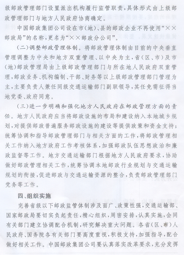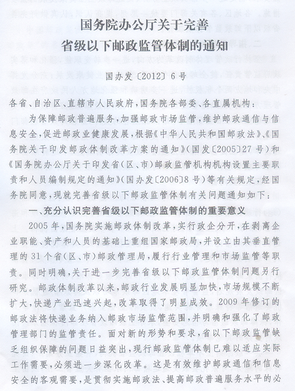 名稱: 轉發國務院辦公廳關于完善省級以下郵政監管體制的通知