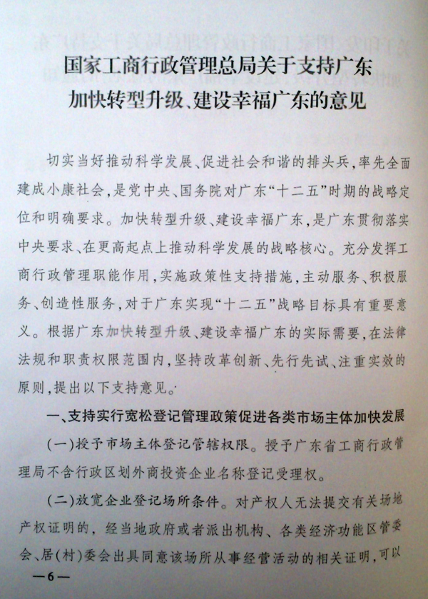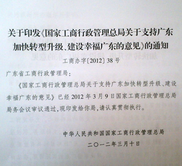 轉(zhuǎn)發(fā)國家工商總局關(guān)于支持廣東加快轉(zhuǎn)型升級 建設(shè)幸福廣東意見的通知