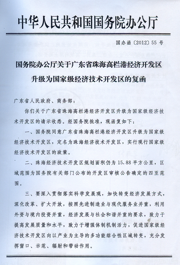 現將《國務院辦公廳關于廣東省珠海高欄港經濟開發區升級為國家級經濟技術開發區的復函》(國辦函〔2012〕55號)