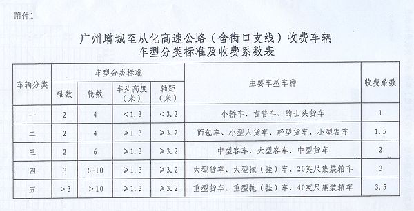 附件:1.廣州增城至從化高速公路(含街口支線)收費車輛車型分類標準及收費系數表