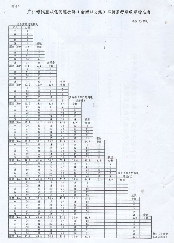 2.廣州增城至從化高速公路(含街口支線)車輛通行費收費標準表