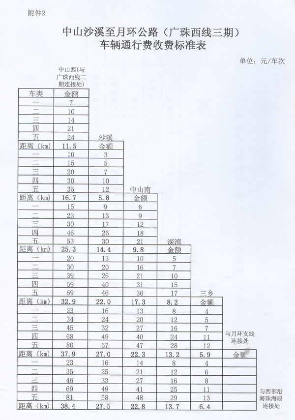 2.中山沙溪至月環公路(廣珠西線三期)車輛通行費收費標準表