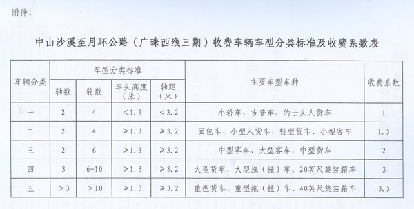 附件:1.中山沙溪至月環公路(廣珠西線三期)收費車輛車型分類標準及收費系數表