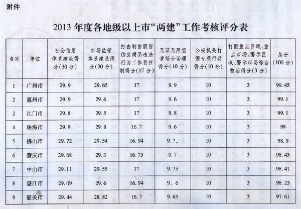 2013年以來,全省各地認(rèn)真貫徹落實(shí)省委、省政府關(guān)于社會(huì)信用體系建設(shè)和市場監(jiān)管體系建設(shè)(以下簡稱“兩建”)工作的各項(xiàng)部署,加強(qiáng)組織領(lǐng)導(dǎo),明確分工責(zé)任,分解工作任務(wù),有計(jì)劃、有目標(biāo)、有步驟地組織開展“兩建”工作,為我省經(jīng)濟(jì)平穩(wěn)健康發(fā)展、社會(huì)和諧穩(wěn)定作出了積極貢獻(xiàn)。根據(jù)《中共廣東省委辦公廳廣東省人民政府辦公廳關(guān)于撤并和規(guī)范省級(jí)考核檢查評(píng)比表彰活動(dòng)的意見》(粵辦發(fā)〔2013〕11號(hào)),2014年1月,省“兩建”工作領(lǐng)導(dǎo)小組辦公室對(duì)各地級(jí)以上市“兩建”工作進(jìn)行了考核。經(jīng)綜合評(píng)定,21個(gè)地級(jí)以上市“兩建”工作考核全部合格,其中,廣州、惠州、江門、珠海市成績比較顯著。經(jīng)省人民政府同意,現(xiàn)將各地“兩建”工作情況通報(bào)如下: 一、精心部署落實(shí) 省“兩建”工作會(huì)議召開后,各地級(jí)以上市政府高度重視,及時(shí)召開相關(guān)工作會(huì)議,認(rèn)真貫徹落實(shí)省委、省政府關(guān)于“兩建”工作的政策部署,并以多種形式出臺(tái)有關(guān)文件,狠抓各項(xiàng)工作任務(wù)落實(shí)。在市場監(jiān)管體系建設(shè)方面,廣州、深圳等市結(jié)合實(shí)際制定了本市的市場監(jiān)管體系建設(shè)規(guī)劃,惠州、陽江等市制定了貫徹落實(shí)省市場監(jiān)管體系建設(shè)規(guī)劃的實(shí)施意見;在社會(huì)信用體系建設(shè)方面,廣州、珠海、中山等市制訂了《社會(huì)信用體系建設(shè)規(guī)劃(2013—2020年)》,廣州市還出臺(tái)了《廣州市信息共享管理規(guī)定》、《廣州市社會(huì)信用促進(jìn)條例》等多項(xiàng)規(guī)章制度。 一是市場準(zhǔn)入體系建設(shè)取得較大突破。率先在全國開展商事登記制度改革試點(diǎn),按照“寬進(jìn)嚴(yán)管”的原則,推進(jìn)工商登記制度改革,清理、壓減前置審批事項(xiàng),放寬登記準(zhǔn)入條件,實(shí)行先證后照,強(qiáng)化事中、事后監(jiān)管。2013年3月1日,深圳、珠海正式實(shí)施具有地方性法規(guī)效力的商事登記制度。據(jù)統(tǒng)計(jì),深圳、珠海、東莞、順德等商事登記制度改革試點(diǎn)地區(qū),新登記市場主體增幅分別達(dá)到96.3%、41.5%、17.0%和16.4%,同期非試點(diǎn)地區(qū)市場主體增幅僅為0.5%。二是行政執(zhí)法體系建設(shè)取得良好效果。進(jìn)一步深化行政審批制度改革,大力簡政放權(quán),共調(diào)整市級(jí)行政審批事項(xiàng)6165項(xiàng)、縣級(jí)14934項(xiàng)。積極探索建立綜合行政執(zhí)法體制,推動(dòng)執(zhí)法重心下移。佛山市順德區(qū)按土地、醫(yī)藥、市場、城市管理四大領(lǐng)域,整合行政執(zhí)法職責(zé)和隊(duì)伍,規(guī)范行政執(zhí)法行為,規(guī)范行政處罰自由裁量權(quán);珠海市制定《珠海市行政機(jī)關(guān)執(zhí)法依據(jù)匯編》、《珠海市規(guī)范行政處罰自由裁量權(quán)工作方案》。三是消費(fèi)維權(quán)和社會(huì)監(jiān)督體系建設(shè)取得重大進(jìn)展。以“12345”熱線為載體整合各部門投訴舉報(bào)資源,建設(shè)便民、高效的消費(fèi)維權(quán)申訴、經(jīng)濟(jì)違法行為舉報(bào)和行政效能投訴平臺(tái),實(shí)現(xiàn)統(tǒng)一接聽、按責(zé)轉(zhuǎn)辦、限時(shí)辦結(jié)、統(tǒng)一督辦、統(tǒng)一考核。除東莞、揭陽市外,目前全省已有19個(gè)地級(jí)以上市實(shí)現(xiàn)“12345”統(tǒng)一投訴舉報(bào)平臺(tái)上線運(yùn)行。四是政務(wù)誠信建設(shè)深入推進(jìn)。積極推進(jìn)招標(biāo)投標(biāo)和政府采購領(lǐng)域政務(wù)誠信建設(shè),全部實(shí)現(xiàn)各市縣網(wǎng)上辦事分廳與省網(wǎng)上辦事大廳對(duì)接,實(shí)現(xiàn)省、市、縣(區(qū))三級(jí)數(shù)據(jù)同步,進(jìn)一步提高行政審批效率。珠海市圍繞電子政務(wù)、科學(xué)民主決策等方面開展政務(wù)誠信建設(shè),在網(wǎng)上辦事大廳珠海分廳增加公共資源網(wǎng)上交易、市民個(gè)人網(wǎng)頁等內(nèi)容。五是加快推進(jìn)質(zhì)量監(jiān)管體系建設(shè)。強(qiáng)化“不合格產(chǎn)品發(fā)現(xiàn)率”理念,著力完善產(chǎn)(商)品監(jiān)督抽查制度,大力實(shí)施標(biāo)準(zhǔn)化戰(zhàn)略,提升電子商務(wù)質(zhì)量,逐步建立現(xiàn)代質(zhì)量監(jiān)管體系。廣州、惠州等市大力完善公共與民生服務(wù)領(lǐng)域標(biāo)準(zhǔn)體系,深圳、佛山等市改革流通領(lǐng)域商品監(jiān)管方式,中山、茂名等市加強(qiáng)產(chǎn)品質(zhì)量監(jiān)督抽查,梅州、肇慶等市大力推動(dòng)旅游電子合同。六是進(jìn)一步理順食品安全監(jiān)管體制機(jī)制。以食品安全監(jiān)管體制改革為契機(jī),進(jìn)一步理順食品安全監(jiān)管職責(zé),出臺(tái)市縣兩級(jí)食品安全監(jiān)管體制改革文件,做好機(jī)構(gòu)編制、職能調(diào)整和人員劃分等工作。 一是信用激勵(lì)和懲戒機(jī)制建設(shè)取得明顯成效。惠州、珠海市分別出臺(tái)了《關(guān)于建立企業(yè)信用聯(lián)動(dòng)獎(jiǎng)懲機(jī)制的意見》、《珠海市守信激勵(lì)和失信懲戒辦法》,積極