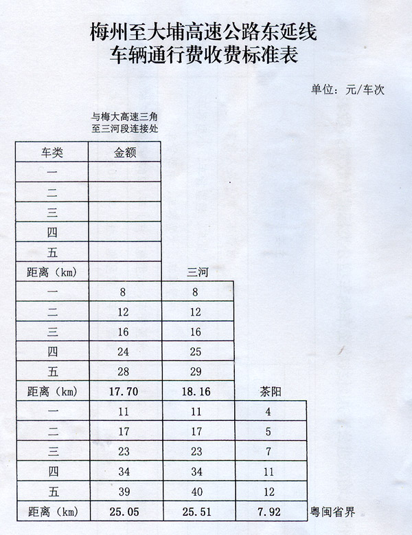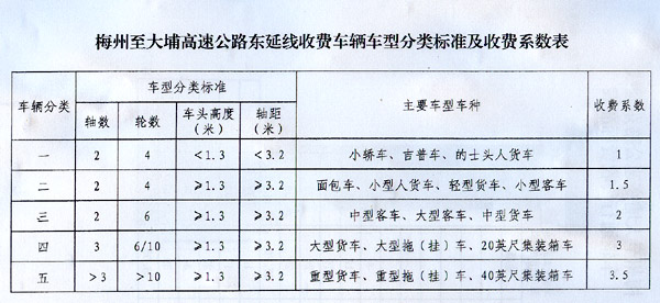 粵交費(fèi)〔2014〕656號請示收悉。同意梅州至大埔高速公路東延線交工驗(yàn)收通車和收費(fèi)站收費(fèi)設(shè)施經(jīng)驗(yàn)收符合省聯(lián)網(wǎng)收費(fèi)技術(shù)要求后開始收費(fèi),收費(fèi)車型按全省高速公路統(tǒng)一標(biāo)準(zhǔn),即按車輛軸(輪)數(shù)及車頭高度等物理參數(shù)進(jìn)行分類,一至五類車的收費(fèi)系數(shù)分別為1、1.5、2、3、3.5;收費(fèi)標(biāo)準(zhǔn)為0.45元/標(biāo)準(zhǔn)車公里。