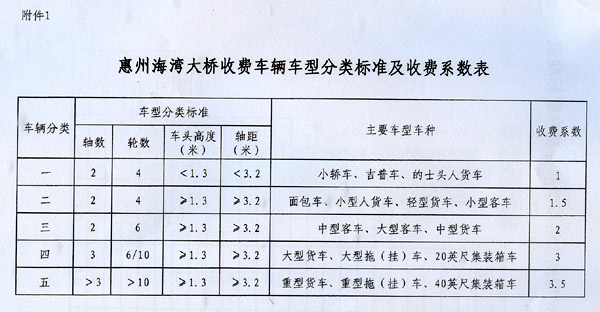 粵交費(fèi)〔2014〕1649號請示收悉。同意惠州海灣大橋項(xiàng)目建成通車和收費(fèi)站收費(fèi)設(shè)施經(jīng)驗(yàn)收符合省聯(lián)網(wǎng)收費(fèi)技術(shù)要求后開始收費(fèi),收費(fèi)車型按全省高速公路統(tǒng)一標(biāo)準(zhǔn),即按車輛軸(輪)數(shù)及車頭高度等物理參數(shù)進(jìn)行分類,一至五類車的收費(fèi)系數(shù)分別為1、1.5、2、3、3.5;凌坑至船澳段收費(fèi)標(biāo)準(zhǔn)為0.45元/標(biāo)準(zhǔn)車公里,船澳至赤沙段收費(fèi)標(biāo)準(zhǔn)為19元/標(biāo)準(zhǔn)車次。
