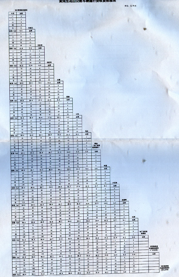 粵交費〔2014〕1455號請示收悉。同意黃崗至花山公路建成通車和收費站收費設施經驗收符合省聯網收費技術要求后開始收費,收費車型按全省高速公路統一標準,即按車輛軸(輪)數及車頭高度等物理參數進行分類,一至五類車的收費系數分別為1、1.5、2、3、3.5;收費標準為0.6元/標準車公里。