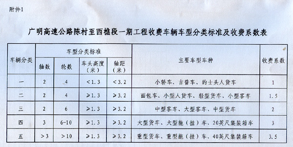 附件:1.廣明高速公路陳村至西樵段一期工程收費車輛車型分類標準及收費系數表