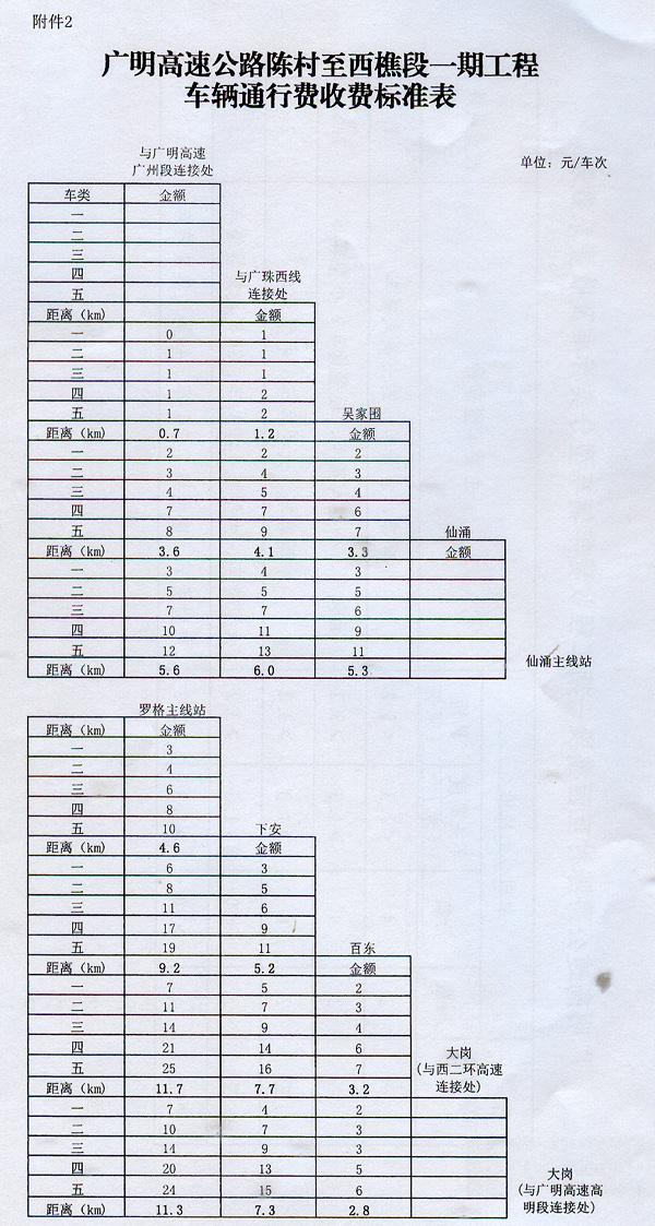 2.廣明高速公路陳村至西樵段一期工程車輛通行費收費標準表