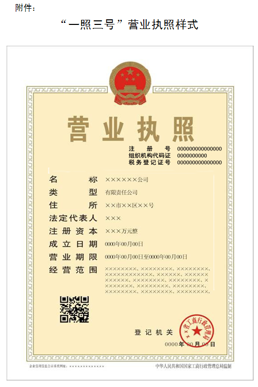 一、同意在廣東自貿試驗區試行“一照三號”登記制度改革。對在廣東自貿試驗區登記設立的企業核發加載工商注冊號、組織機構代碼和稅務登記號的營業執照(“一照三號”營業執照樣式附后,前海、橫琴片區使用的特區營業執照參照該樣式加載有關證照號碼),不再單獨核發組織機構代碼證、稅務登記證。