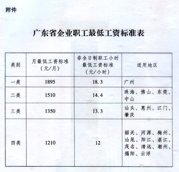 附件:廣東省企業職工最低工資標準表