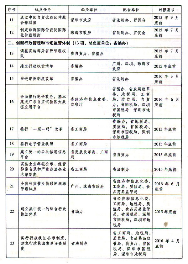 19.開展綜合執(zhí)法改革試點(diǎn)。支持廣東自貿(mào)試驗(yàn)區(qū)探索建立集中統(tǒng)一的綜合執(zhí)法體系,相對集中執(zhí)法事權(quán),試行“一支隊(duì)伍管執(zhí)法”。建設(shè)廣東自貿(mào)試驗(yàn)區(qū)綜合執(zhí)法信息平臺,集執(zhí)法信息公示、網(wǎng)上執(zhí)法辦案、聯(lián)勤聯(lián)動指揮、綜合執(zhí)法監(jiān)察等功能于一體,實(shí)現(xiàn)綜合行政執(zhí)法信息化管理。實(shí)行行政執(zhí)法公示制度,建立行政執(zhí)法案卷評查制度。