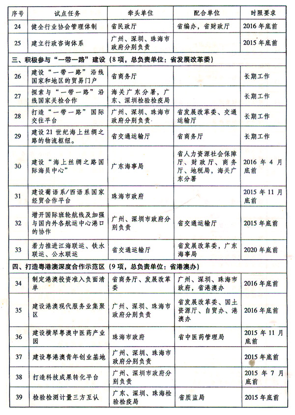 (四)打造粵港澳深度合作示范區(qū)。 在《內(nèi)地與香港、澳門關(guān)于建立更緊密經(jīng)貿(mào)關(guān)系的安排》及其補(bǔ)充協(xié)議(以下稱CEPA)框架下,在廣度上拓寬粵港澳合作領(lǐng)域,進(jìn)一步取消和放寬港澳投資者準(zhǔn)入限制;在深度上創(chuàng)新粵港澳合作機(jī)制,在規(guī)則標(biāo)準(zhǔn)對接、項(xiàng)目資金互通、要素便捷流動等方面先行先試,打造粵港澳聯(lián)手參與國際競爭的合作新載體。
