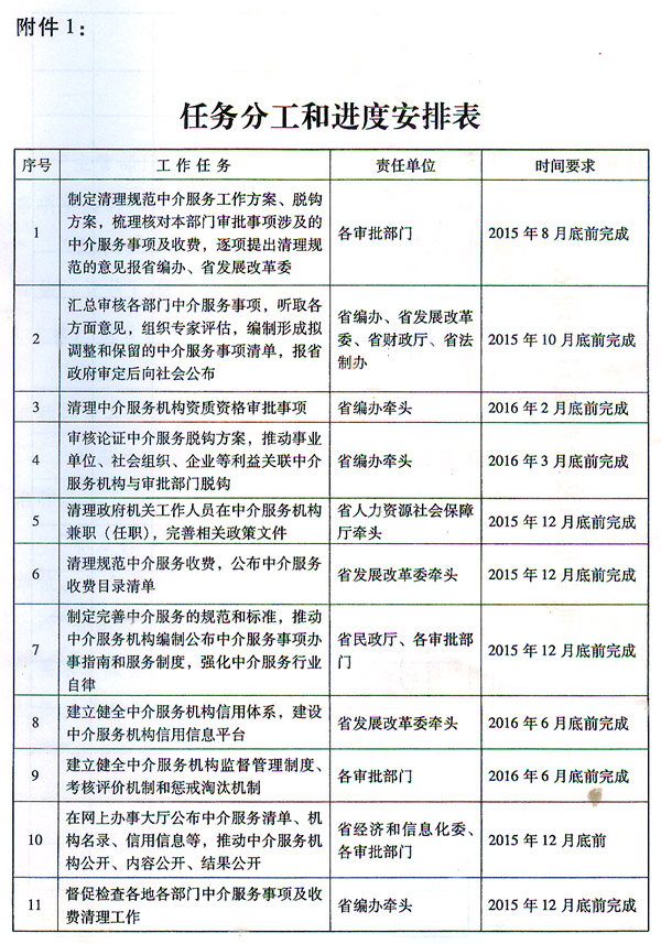 各有關部門要充分認識清理規范中介服務工作的重要性和緊迫性,切實加強組織領導,將清理規范工作與行政審批制度改革、分類推進事業單位改革、推進行業協會商會與行政機關脫鉤、建設社會信用體系等工作結合起來,制定本部門、本系統清理規范的具體工作方案,認真抓好落實,并建立健全申請人對中介服務評價反饋機制,向社會公布舉報投訴電話、電子郵箱等,主動接受社會監督。各有關部門對照本單位實施的行政審批事項,梳理填報《中介服務事項及收費項目清理表》(見附件2),于2015年8月20日前報送省編辦、發展改革委。事業單位、社會組織、企業等利益關聯中介服務機構與審批部門脫鉤方案于12月31日前報送省編辦。省編辦要會同省發展改革委、財政廳、民政廳、法制辦等部門,及時跟蹤各審批部門工作進展情況,加強統籌協調和督促檢查,確保清理規范中介服務工作取得實效。