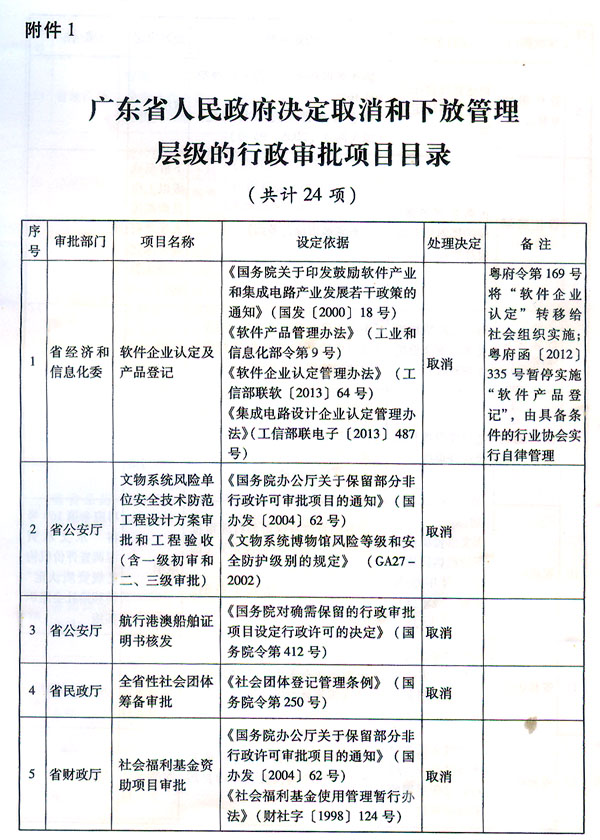為貫徹落實《國務院關于取消和調(diào)整一批行政審批項目等事項的決定》(國發(fā)〔2015〕11號),進一步深化我省行政審批制度改革,經(jīng)研究論證,省政府決定再取消和下放24項行政審批項目,將3項工商登記前置審批事項改為后置審批。請各地、各部門抓緊做好取消和調(diào)整事項的落實和銜接工作,加快配套改革和后續(xù)監(jiān)管制度建設,切實做到放管結合,不斷提高政府管理科學化、規(guī)范化水平。 ? ? ? 廣東省人民政府 2015年8月7日 ? ?