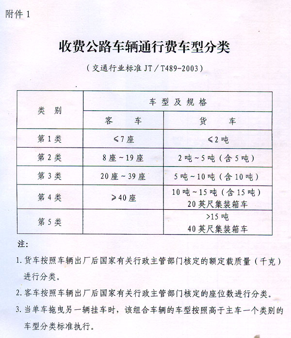 附件:1.收費公路車輛通行費車型分類(交通行業標準JT/T489-2003)