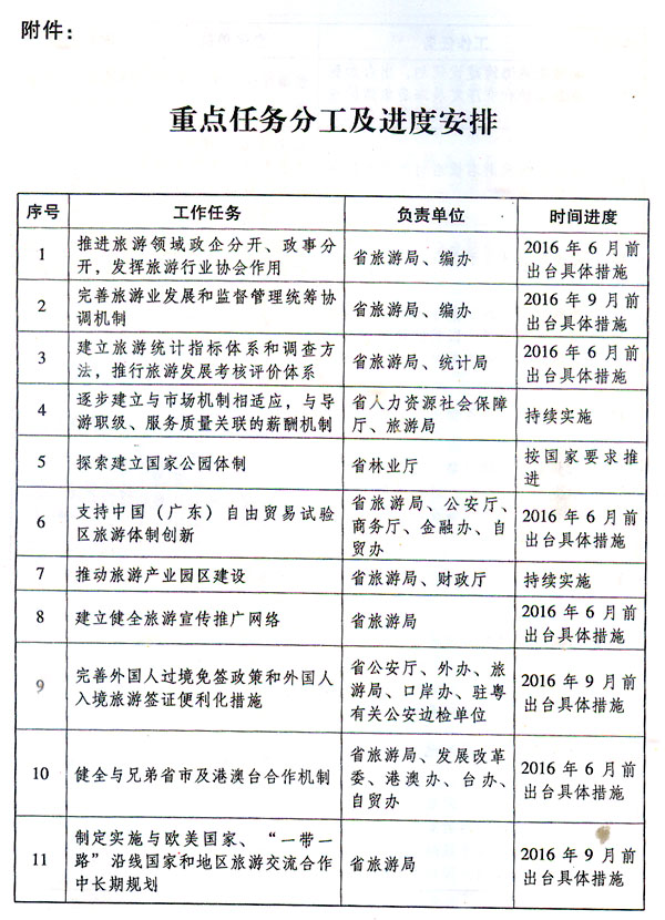 ?。ㄒ唬┥罨糜尉C合改革。加快推進旅游領域政企分開、政事分開,進一步發揮旅游行業協會作用,加強事中、事后監管。完善旅游業發展和管理統籌協調機制,促進旅游資源要素優化配置。深入實施《珠江三角洲地區旅游一體化規劃》,發揮廣州作為全國旅游綜合改革試點城市的引領作用,推進珠三角地區打造全國旅游綜合改革創新示范先行區,加快推進省級旅游綜合改革示范市和示范縣(區)的改革創新工作。積極爭取國家支持我省探索休假制度改革,探索建立國家公園體制。深化導游管理體制改革,逐步建立與市場機制相適應,與導游職級、服務質量相關聯的薪酬機制。建立旅游統計指標體系和旅游發展考核評價體系,推動實現旅游衛星賬戶模式常態化。加大中國(廣東)自由貿易試驗區旅游體制創新力度,支持區內港澳獨資旅行社經營內地居民出國(境)(不含臺灣地區)團隊旅游業務。?