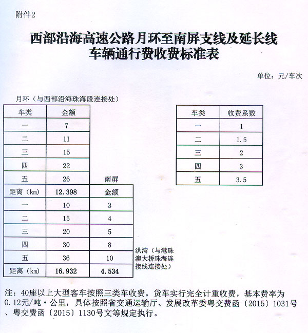 粵交費〔2015〕1393號請示收悉。同意西部沿海高速公路月環至南屏支線及延長線建成通車和收費站收費設施經驗收符合省聯網收費技術要求后開始收費,收費車型按國家統一標準進行分類,一至五類車的收費系數分別為1、1.5、2、3、3.5,收費標準為0.6元/標準車公里;貨車實行完全計重收費,基本費率為0.12元/噸·公里。