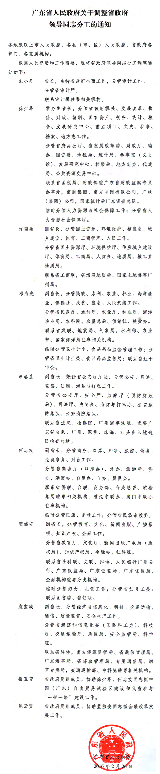 名稱: 廣東省人民政府關于調整省政府領導同志分工的通知