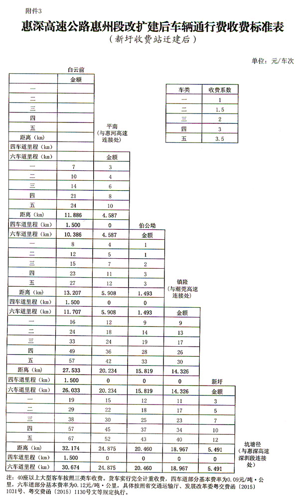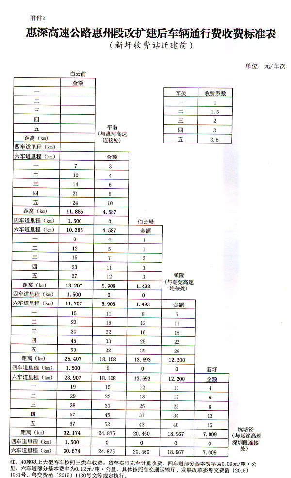 ? 廣東省人民政府關(guān)于惠深高速公路惠州段 調(diào)整車輛通行費收費標(biāo)準(zhǔn)有關(guān)問題的批復(fù) ? 省交通運輸廳、發(fā)展改革委: 粵交費〔2016〕135號請示收悉。同意惠深高速公路惠州段改擴建工程交工驗收通車和收費站收費設(shè)施經(jīng)驗收符合省聯(lián)網(wǎng)收費技術(shù)要求后調(diào)整車輛通行費收費標(biāo)準(zhǔn),收費車型按國家統(tǒng)一標(biāo)準(zhǔn)進(jìn)行分類,1至5類車的收費系數(shù)分別為1、1.5、2、3、3.5,改擴建段(30.674公里)收費標(biāo)準(zhǔn)調(diào)整為0.6元/標(biāo)準(zhǔn)車公里,起點段(1.5公里)收費標(biāo)準(zhǔn)保持0.45元/標(biāo)準(zhǔn)車公里不變;貨車實行完全計重收費,改擴建段(30.674公里)基本費率調(diào)整為0.12元/噸。公里,起點段(1.5公里)基本費率保持0.09元/噸。公里不變。