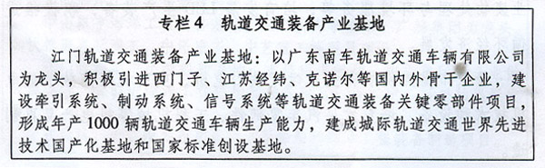 (四)軌道交通裝備。 以江門市為主,依托珠三角城際軌道交通網(wǎng)絡(luò)建設(shè),重點發(fā)展軌道交通裝備及其關(guān)鍵系統(tǒng)零部件,建立健全研發(fā)設(shè)計、生產(chǎn)制造和產(chǎn)品標(biāo)準(zhǔn)、知識產(chǎn)權(quán)保護體系,提升裝備自主化能力。加快延伸產(chǎn)業(yè)鏈,大力提高整車配套和生產(chǎn)能力。研究開發(fā)磁懸浮、真空管道等超高速軌道交通技術(shù)及相關(guān)裝備。到2017年,形成1000輛軌道交通車輛年生產(chǎn)能力。到2020年,建成世界一流的高端軌道交通裝備修造產(chǎn)業(yè)基地。