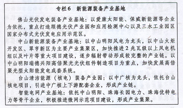 重點發(fā)展光伏裝備、風(fēng)電裝備和核電裝備,延伸發(fā)展產(chǎn)業(yè)鏈,加快發(fā)展新型傳感測量、通訊信息、電能質(zhì)量控制、決策支持、超導(dǎo)、分布式電源柔性接入技術(shù)等智能電網(wǎng)先進技術(shù),培育開發(fā)高溫氣冷堆、10兆瓦及以上風(fēng)電和光伏發(fā)電技術(shù)及裝備。以佛山市、中山市為主,重點發(fā)展高倍聚光型太陽能發(fā)電成套系統(tǒng);以中山市為主,重點發(fā)展大型風(fēng)電機組整機及部件,提升研發(fā)水平,加強海上風(fēng)電機組及風(fēng)光互補系統(tǒng)研制及產(chǎn)業(yè)化;以江門市為主,重點發(fā)展核電輔助裝備和非動力核技術(shù)。到2017年,培育形成1-2家系統(tǒng)設(shè)計、設(shè)備制造一體化的輸配電工程總承包公司。到2020年,打造成為國內(nèi)重要的新能源裝備制造基地之一。