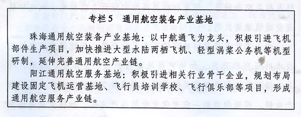 以珠海市為主,以低空領(lǐng)域開放為契機,重點發(fā)展航空關(guān)鍵技術(shù)研發(fā),以及通用飛機、水上飛機、無人機、特種飛行器和輕型直升機等,積極發(fā)展機場空管導(dǎo)航監(jiān)視裝備和牽引車、氣源車、電源車和空調(diào)車等機場地勤設(shè)備。研究開發(fā)地效飛行器、通用航空發(fā)動機等高端航空裝備。到2017年,培育壯大1家通航裝備制造企業(yè)。到2020年,成為國內(nèi)主要通用航空產(chǎn)業(yè)基地之一。