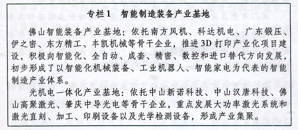 (一)智能制造裝備。 以佛山市、順德區(qū)為主,重點發(fā)展關(guān)鍵智能制造基礎(chǔ)共性技術(shù),推進以傳感器、自動控制系統(tǒng)、工業(yè)機器人、伺服和執(zhí)行部件為代表的智能裝置的研發(fā)和產(chǎn)業(yè)化,大幅提高制造過程信息化水平,培育開發(fā)智能化生產(chǎn)線和數(shù)字化車間(工廠),以及高精密數(shù)控機床及系統(tǒng)、工作母機等重大設(shè)備,提升重大智能成套裝備的集成水平,形成高度靈活、個性化、網(wǎng)絡(luò)化的產(chǎn)業(yè)鏈。支持智能制造裝備企業(yè)在工程承包、維修改造、設(shè)備租賃等方面開展增值服務(wù),促進企業(yè)由加工制造型向生產(chǎn)服務(wù)型轉(zhuǎn)變。到2017年,初步建成在全國具有較大影響力的智能制造裝備產(chǎn)業(yè)基地。到2020年,產(chǎn)值規(guī)模達2000億元,形成2家以上行業(yè)領(lǐng)軍企業(yè)。