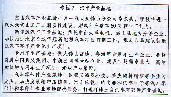 佛山市重點發(fā)展高端轎車、高附加值和多功能客車,以及旅居車、清障車、工程車等特色專用車,延伸發(fā)展變速箱、發(fā)動機、安全氣囊、電控系統(tǒng)等關(guān)鍵零部件,提高本地配套率,形成較完善的汽車產(chǎn)業(yè)鏈。培育發(fā)展純電動轎車,加快建立正負極材料、隔膜、電解液等動力電池配套能力。