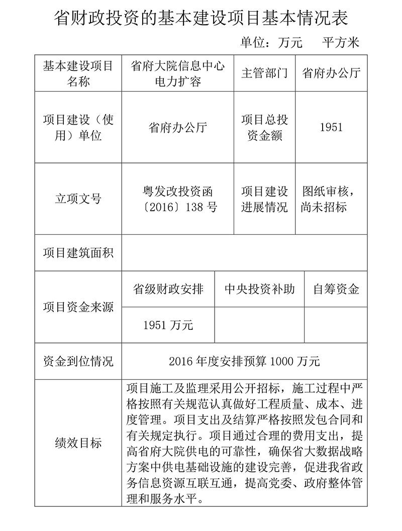 省府大院信息中心電力擴容項目由我廳于2015年1月向省發展改革委申請立項(粵辦函〔2015〕1號),今年1月省發展改革委粵發改投資函〔2016〕138號文批復我廳同意項目立項,今年3月你廳粵財建〔2016〕27號文批復該項目2016年度預算資金1000萬元。