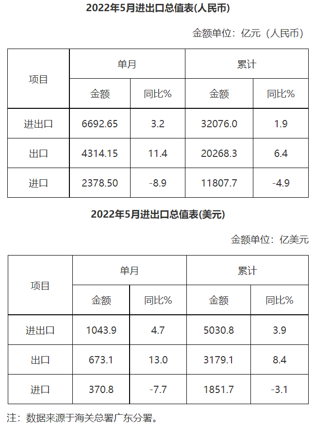廣東省外貿進出口總值表(2022年5月)