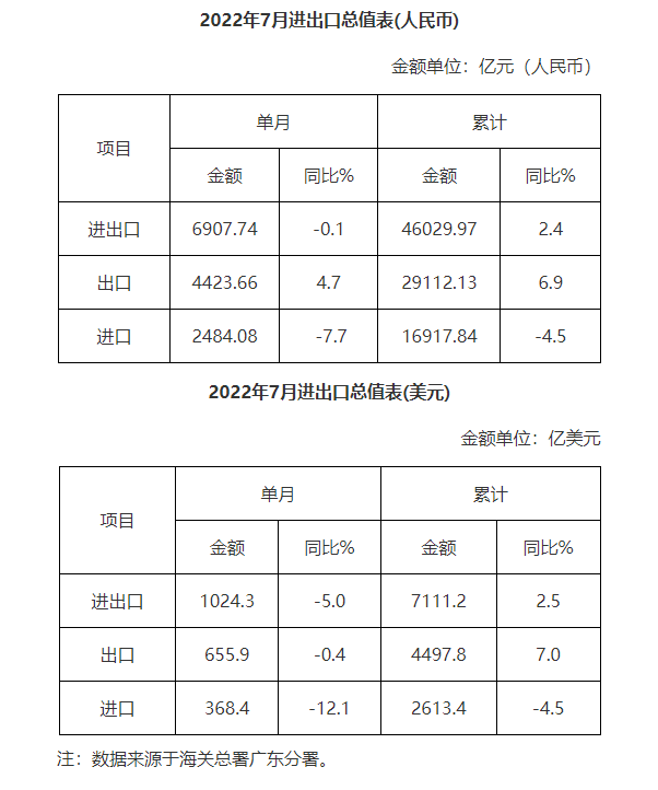 廣東省外貿進出口總值表(2022年7月)